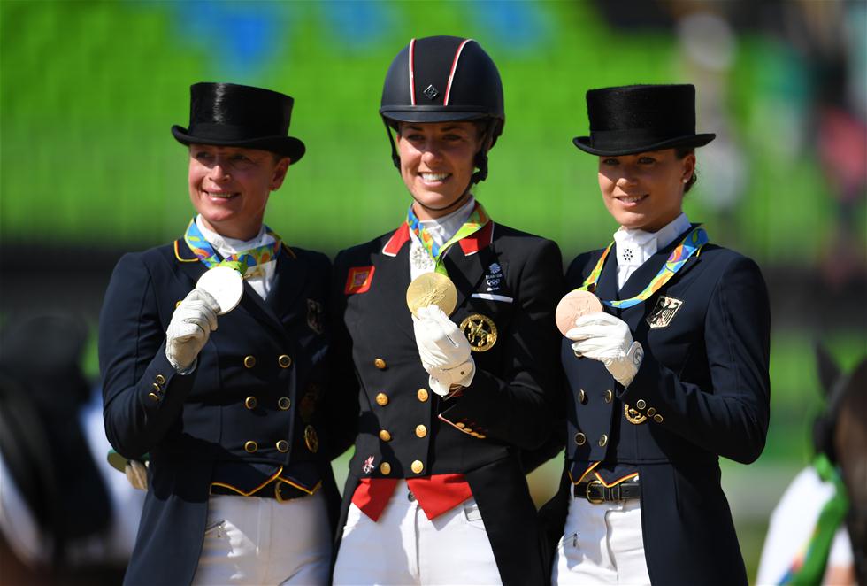 8月15日,英国选手迪雅尔丹(中)、德国选手韦特(左)与布勒林在颁奖仪式上。当日,在2016年里约奥运会马术个人盛装舞步自由演绎大奖赛决赛中,英国选手迪雅尔丹以93.857分的成绩获得金牌,德国选手韦特和布勒林分别获得二、三名。