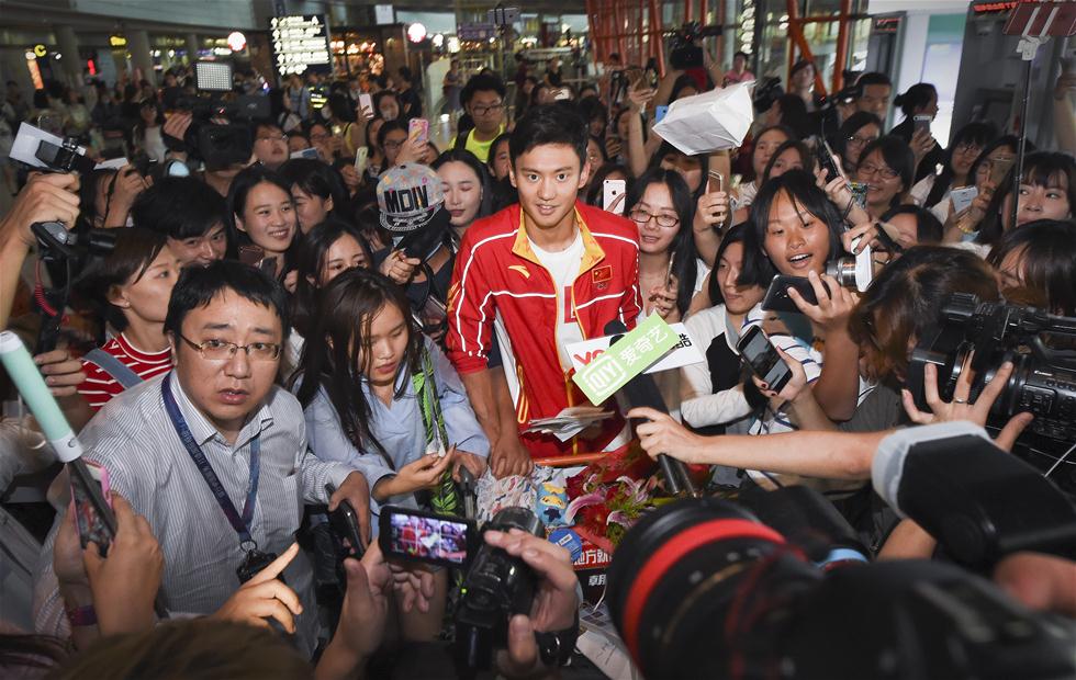 8月16日,中国游泳队选手宁泽涛(中)抵达北京首都国际机场后被媒体记者和粉丝包围。当日,参加2016里约奥运会的中国游泳队部分队员回国。