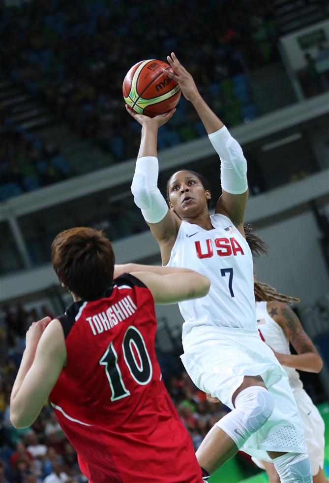 8月16日,美国队球员莫尔(右)在比赛中投篮。当日,在2016年里约奥运会女篮四分之一决赛中,美国队以110比64战胜日本队,晋级四强。