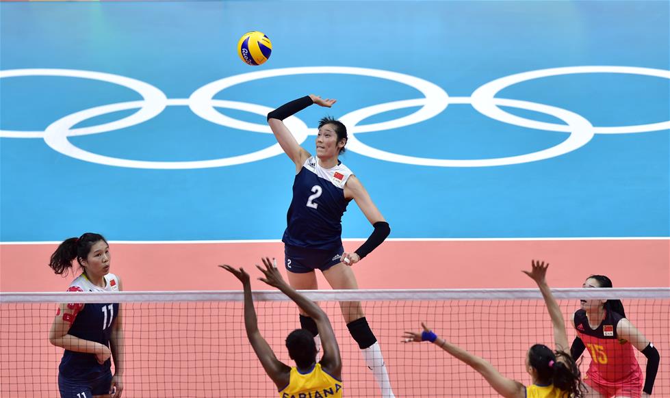 8月16日,中国队球员朱婷(上)在比赛中扣球。当日,在2016年里约奥运会女子排球四分之一决赛中,中国队以3比2战胜巴西队,晋级四强。