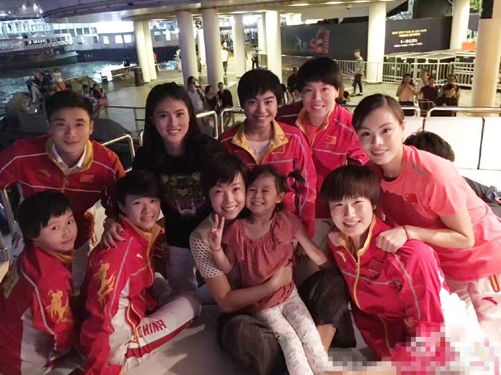 2016年8月29日,奥运精英代表团正在香港访问,大魔王张怡宁带着爱女“小魔王”与乒乓球队的叔叔阿姨们玩的不亦乐乎,郭晶晶也来看望后辈。