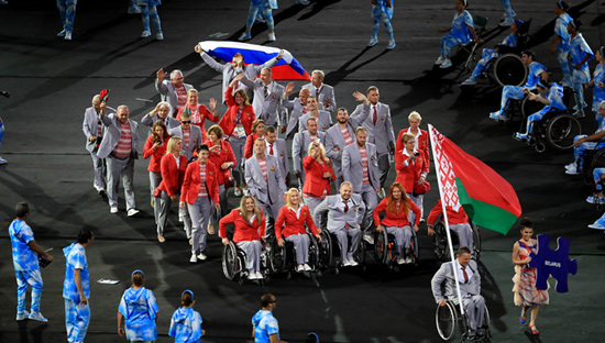 2016年9月8日,里约残奥会开幕式,据俄罗斯卫星网报道,白俄罗斯残奥委会主席奥列格·舍佩尔8日表示,该国代表团在里约残奥会开幕式上举着俄罗斯国旗入场,以示对被禁赛的俄残奥运动员的支持。不过旗帜最后被没收了。