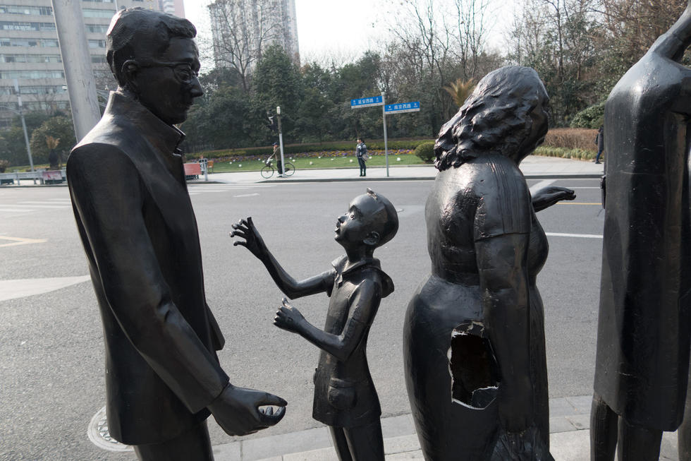 上海街头雕塑破大窟窿 成行人垃圾箱