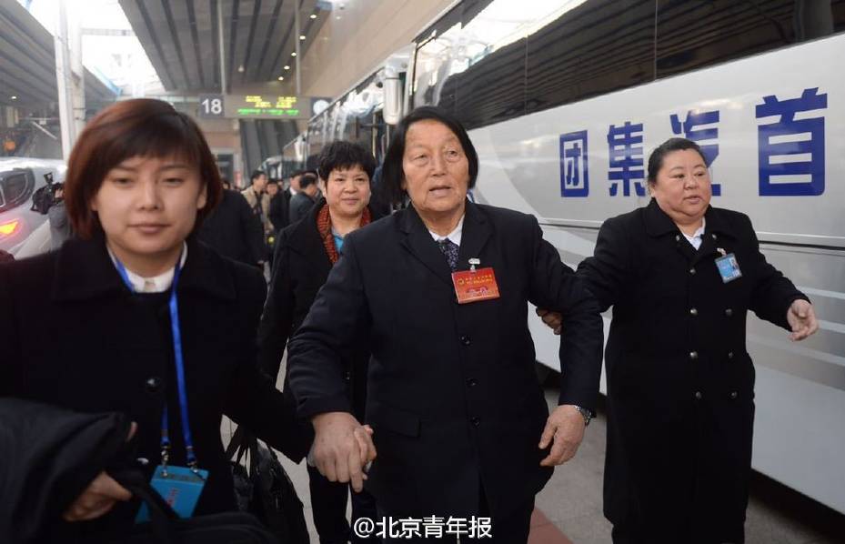 2016年3月2日11点,参加十二届全国人大四次会议的山西代表团乘坐G92次列车抵达北京西站。全国唯一一名连任12届全国人大代表申纪兰随团抵达,出生于1929年的申纪兰今年已是87岁高龄,这是申纪兰第50次出席全国人代会。(北青报摄影记者 郝羿)
