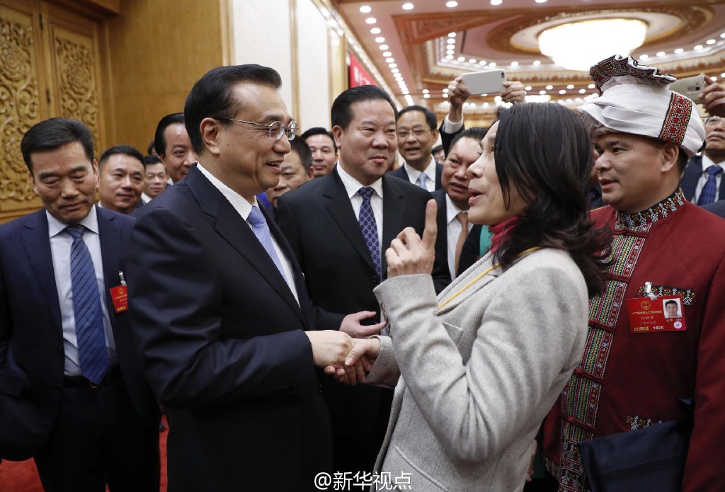 据新华视点报道,2016年3月9日,李克强参加广东代表团审议,表示广东经济社会各项指标均处全国前列,体现出广东人能干、会干。广东人不仅有“敢为人先”的精神,还有“无中生有”的本事。只要给一个政策,哪怕没配套资金,也能从中淘出“金”来。图为李克强与董明珠握手。