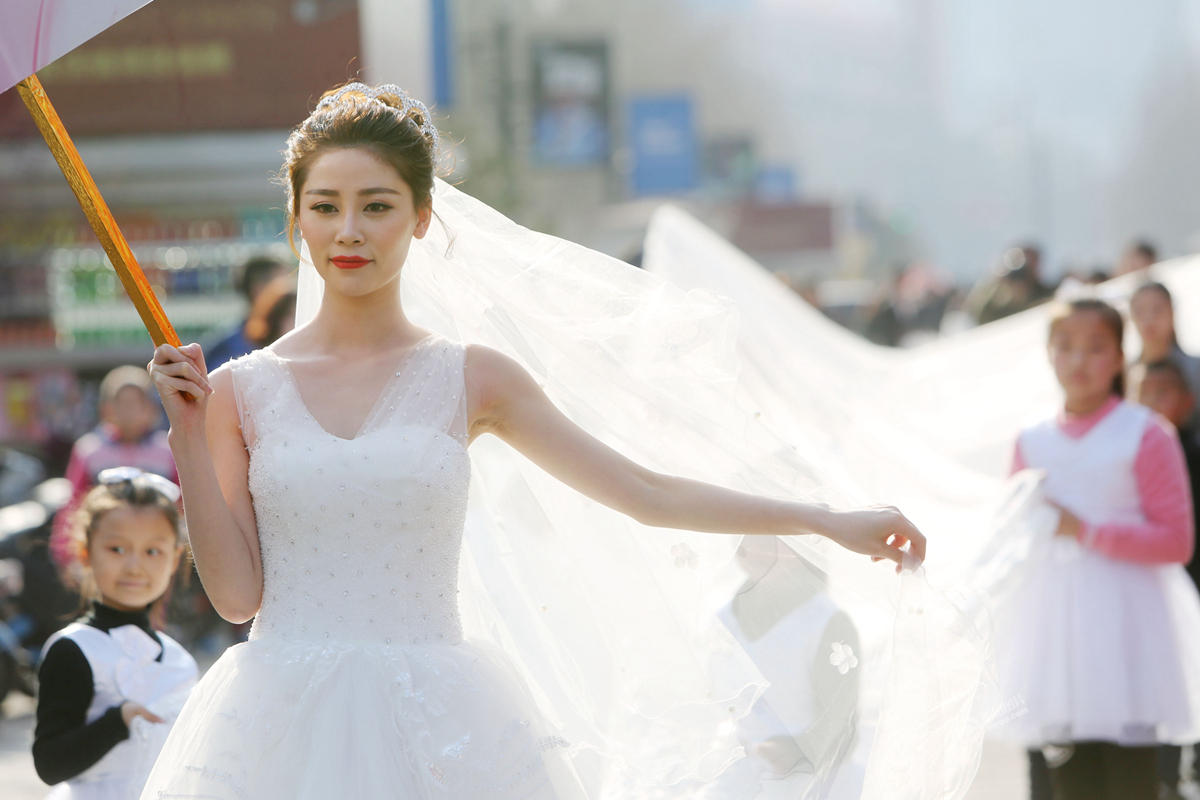 3月13日,济南商业街泉城路,一位模特身穿101米长的婚纱行走街头,震惊路人。据了解,该婚纱以“百里挑一”为主题,通体由精致的蕾丝及数千颗水钻手工定制,花费30多万。陈宁/视觉中国