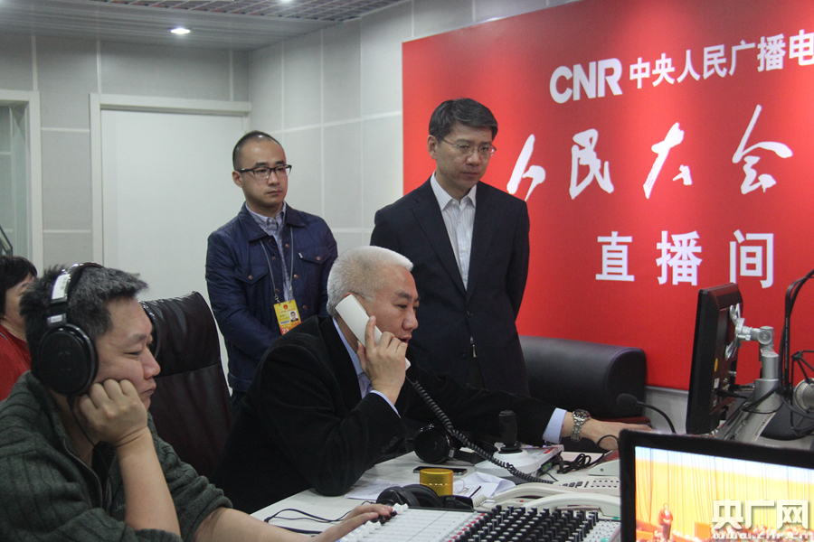 中央人民广播电台副总编辑刘晓龙,总编室主任潘晓闻梳理直播流程。