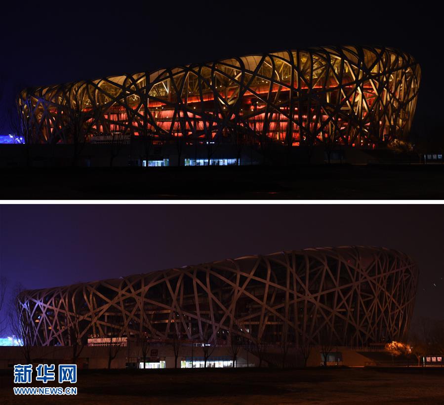 这是3月19日北京“鸟巢”熄灯前后的拼版照片。