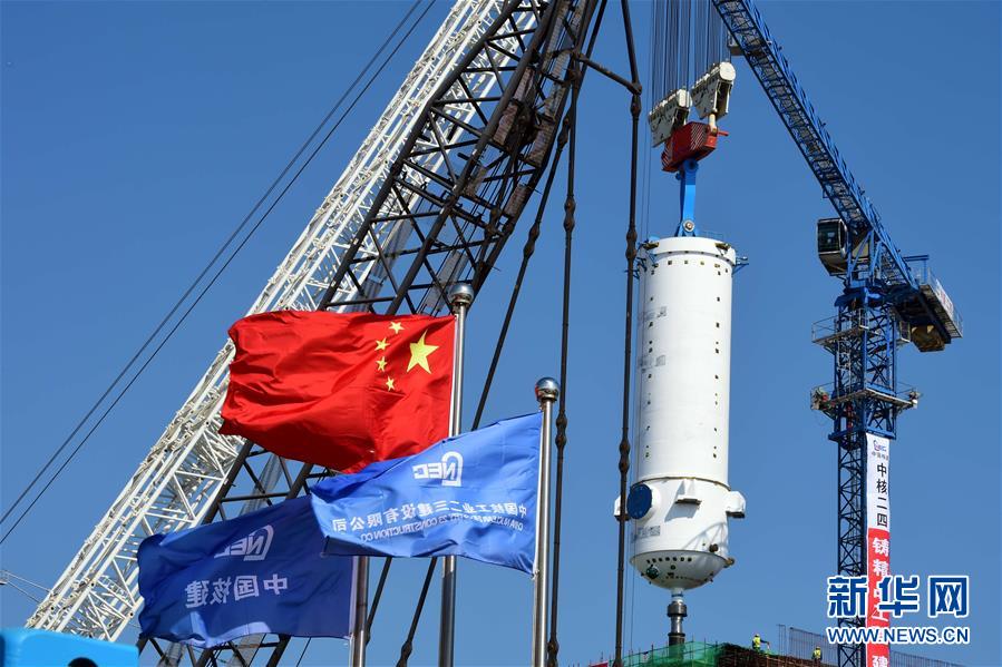 3月20日,在华能山东石岛湾核电厂,反应堆压力容器在吊装中。