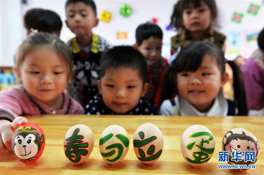 3月20日,河北省邯郸市峰峰矿区区直机关幼儿园的小朋友们在玩“立蛋”游戏。