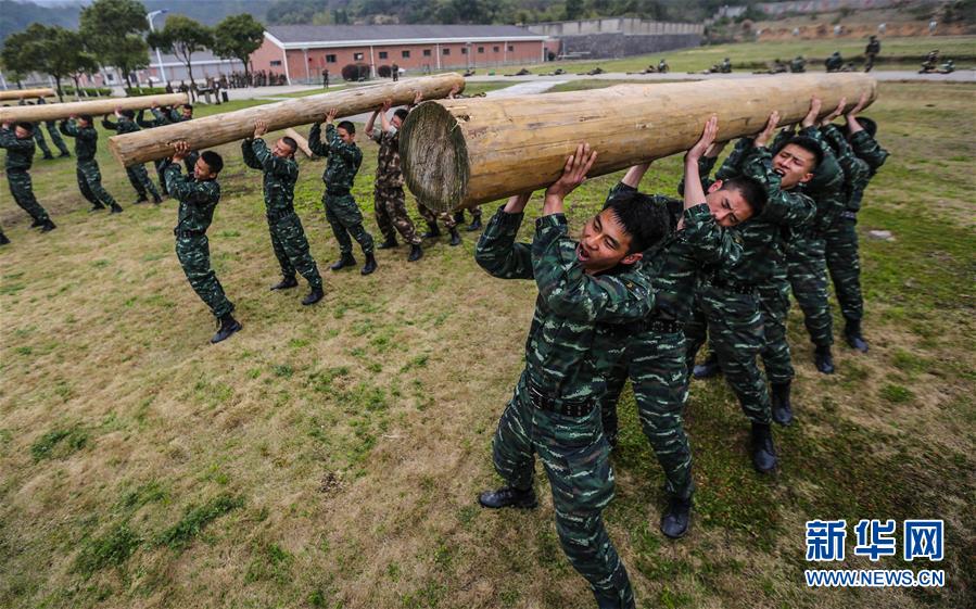 3月19日,宁波武警支队特战队员开展托举圆木训练。