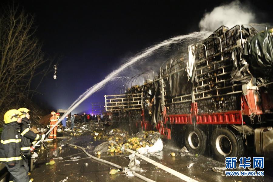 3月20日,消防人员在事故现场救援。从湖南省交警总队获悉,京港澳高速湖南段汽车爆炸事故已致5人死亡,20人受伤,其中4人重伤。19日20时40分许,一辆装载疑似易燃易爆物品的大货车在京港澳高速由南往北行驶至1414公里时起火爆炸。目前,事故救援、现场勘查、事故调查等工作仍在进行中。新华社发