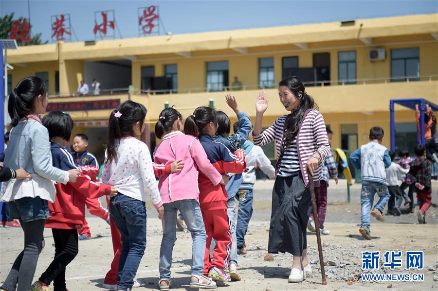 5月16日,李元芳在课间休息时与孩子们一起做游戏。