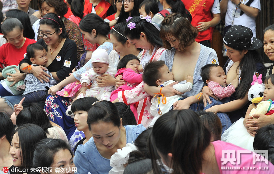 2016年5月21日,福建福州,百余名母乳妈妈齐聚福州三坊七巷南后街,在“5.20全国母乳喂养宣传日”之际,举行主题为“勇敢喂爱 为爱勇敢”的“哺乳快闪”活动。