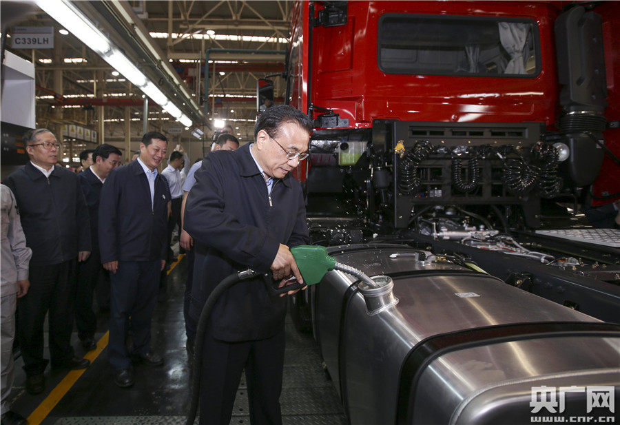 李克强23日到湖北十堰考察东风商用车重卡新工厂,在装配生产线旁应邀为新型重卡加油。