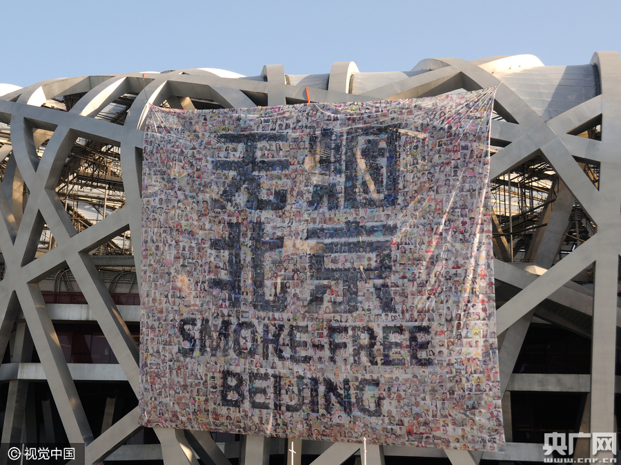 北京鸟巢悬挂巨幅禁烟等标志