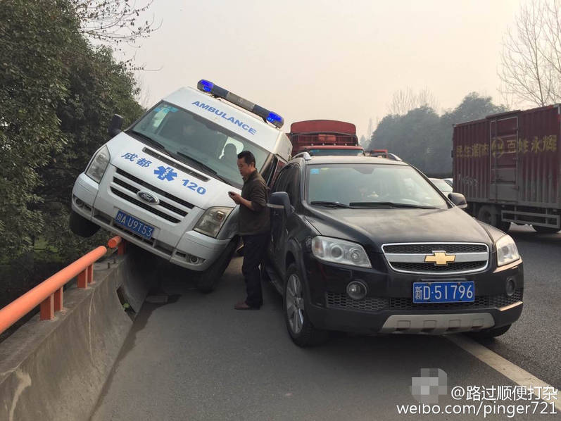 1月15日报道,据成都商报官方微博,网友@路过顺便打杂 爆料,今天中午12点半左右,在成都绕城高速路上,一辆120救护车被一辆私家车迫上护栏。据网友称,今日高速路大堵车,而这辆私家车正在抢占应急车道,后面行驶而来救护车为了避让,结果被迫上了护栏!
